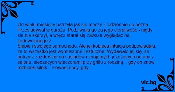Siebie i swojego samochodu. Ale jej kobieca intuicja podpowiadała, że to wszystko jest wymuszone i sztuczne. Wydawało jej się, że patrzy z zazdrością na sąsiadów i znajomych jeżdżących autami z salonu, siedzących wieczorami przy grillu z rodziną... gdy on znów rozbierał silnik... Pewnej nocy, gdy pracował do późna w garażu podjęła ostateczną decyzję... Wszystko miała dokładnie zaplanowane. Okazja pojawiła się, gdy wyjechał na parę dni w delegację, służbowym samochodem. W jeden dzień załatwiła kredyt w banku i wizytę u dealera. Na drugi zamówiła lawetę. Teraz pozostało tylko czekać... a w garażu... taki nowiutki... błyszczący... musi mu się