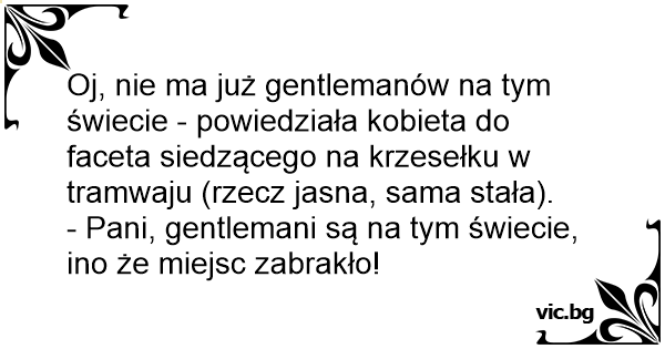 Oj, nie ma już gentlemanów na tym świecie - powiedziała kobieta do faceta siedzącego na krzesełku w tramwaju (rzecz jasna, sama stała).