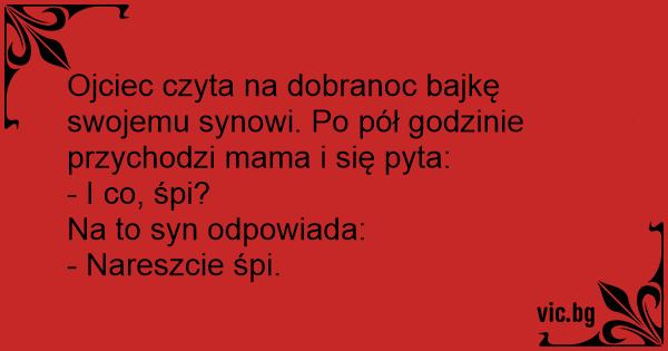 Ojciec czyta na dobranoc bajkę swojemu synowi. Po pół godzinie przychodzi mama i się pyta: