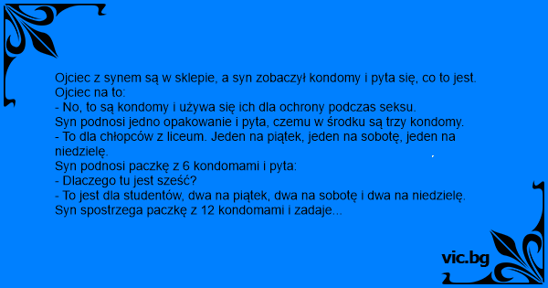 Syn spostrzega paczkę z 12 kondomami i zadaje to samo pytanie. Ojciec na to: