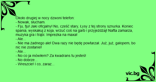 - Fju, fju! Jaki oficjalny! No, cześć stary, Łysy z tej strony sznurka. Koniec spania, wyskakuj z koja, wrzuć coś na garb i przyjeżdżaj! Nafta zamarza, muzyka gra i trąbi. Imprezka na maxa!