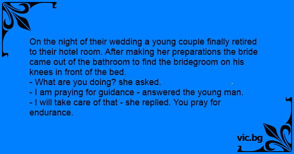On the night of their wedding a young couple finally retired to their hotel room. After making her preparations the bride came out of the bathroom to find the bridegroom on his knees in front of the bed.
