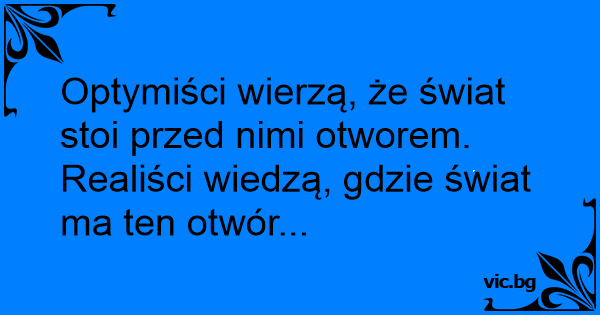Optymiści wierzą, że świat stoi przed nimi otworem. Realiści wiedzą, gdzie świat ma ten otwór...