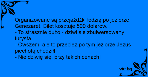 O sujeito vai para Israel visitar a família e aproveita para visitar alguns lugares históricos: Jerusalém, Belém, o rio Jordão.. Quando chega no lago da Galiléia, ele resolve fazer um passeio de barco e pergunta preço para um sujeito que alugava barcos: - Oitenta dólares a hora!- responde ele....