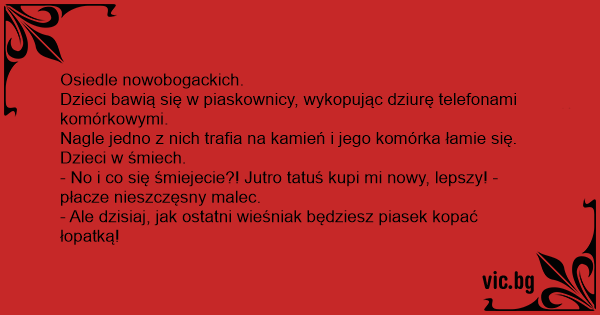 - No i co się śmiejecie?! Jutro tatuś kupi mi nowy, lepszy! - płacze nieszczęsny malec.