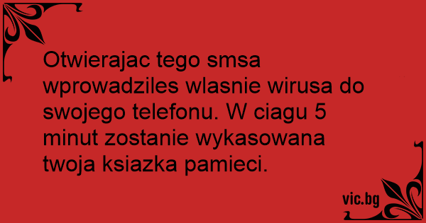 Otwierajac tego smsa wprowadziles wlasnie wirusa do swojego telefonu. W ciagu 5 minut zostanie wykasowana twoja ksiazka pamieci.