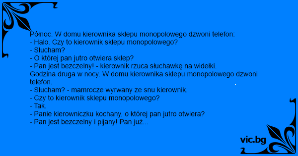 - Pan jest już kompletnie pijany - syczy kierownik. W takim stanie nawet wieczorem nie wpuszczę pana do sklepu!