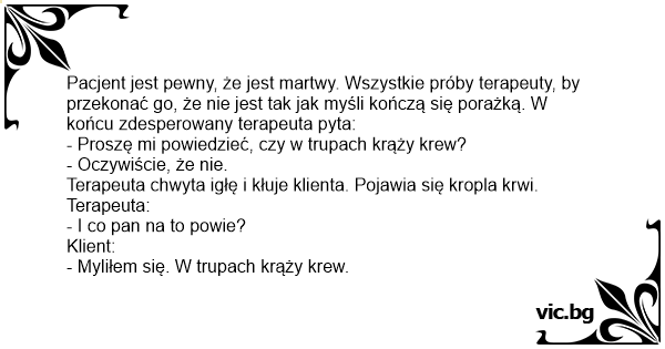 Pacjent jest pewny, że jest martwy. Wszystkie próby terapeuty, by przekonać go, że nie jest tak jak myśli kończą się porażką. W końcu zdesperowany terapeuta pyta:
