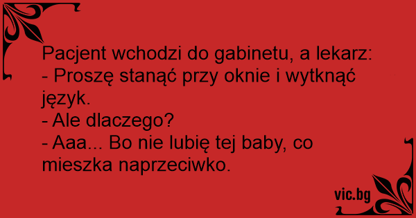 - Panie Doktorze, boli mnie gardło. - Proszę podejść do okna i wystawić język. - Czy to pomoże? - Nie, ale nie lubię moich sąsiadów.