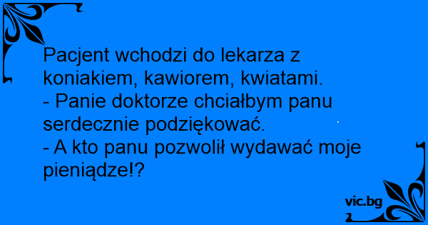Pacjent wchodzi do lekarza z koniakiem, kawiorem, kwiatami.