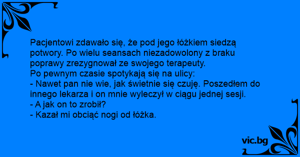 O cara foi ao psiquiatra e se queixou: — Sabe doutor, sempre que estou deitado tenho a impressão que existe alguem embaixo da cama! — Isso é grave, mas podemos fazer um tratamento... — Quanto vai...