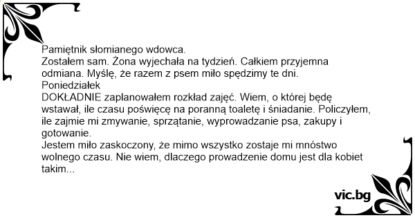 Zostałem sam. Żona wyjechała na tydzień. Całkiem przyjemna odmiana. Myślę, że razem z psem miło spędzimy te dni.