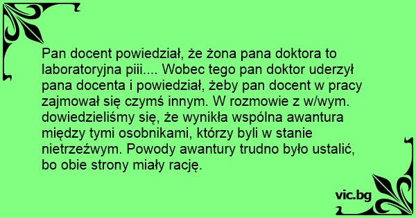 Pan docent powiedział, że żona pana doktora to laboratoryjna piii.... Wobec tego pan doktor uderzył pana docenta i powiedział, żeby pan docent w pracy zajmował się czymś innym. W rozmowie z w/wym. dowiedzieliśmy się, że wynikła wspólna awantura między tymi osobnikami, którzy byli w stanie nietrzeźwym. Powody awantury trudno było ustalić, bo obie strony miały rację.