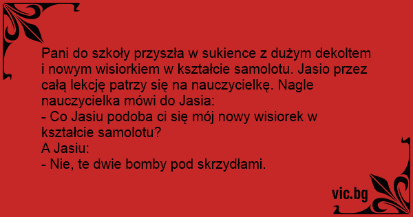 Pani do szkoły przyszła w sukience z dużym dekoltem i nowym wisiorkiem w kształcie samolotu. Jasio przez całą lekcję patrzy się na nauczycielkę. Nagle nauczycielka mówi do Jasia: