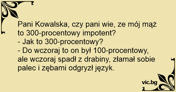 En kvinna berättar för sin väninna: - Min man är 300% impotent. - Va?! säger väninnan. Inte kan man väl vara 300% impotent? - Joo då.. igår var han bara 100% impotent men så ramlade han i morse,...