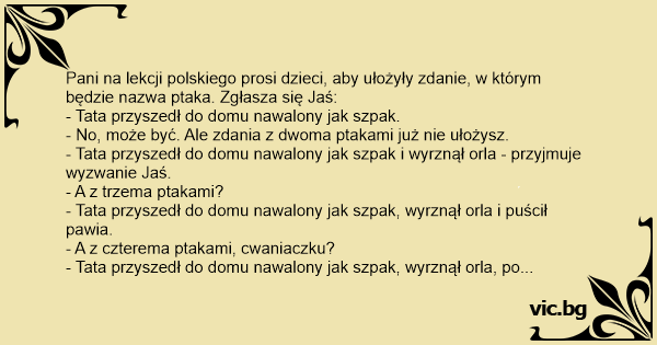 Pani na lekcji polskiego prosi dzieci, aby ułożyły zdanie, w którym będzie nazwa ptaka. Zgłasza się Jaś: