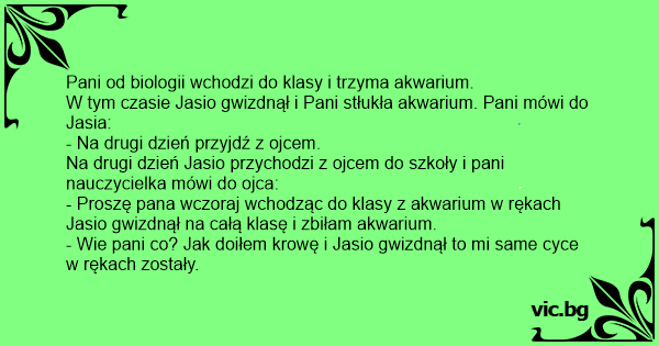 - Proszę pana wczoraj wchodząc do klasy z akwarium w rękach Jasio gwizdnął na całą klasę i zbiłam akwarium.