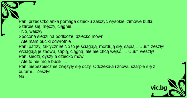Pani zacisnęła ręce mocno na szafce, odczekała, aż przestaną jej się trząść, i znowu pomaga dziecku wciągnąć buty. Wciągają, wciągają..... weszły!.