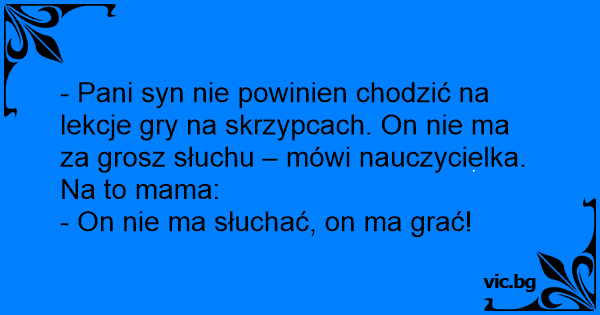 - Pani syn nie powinien chodzić na lekcje gry na skrzypcach. On nie ma za grosz słuchu – mówi nauczycielka.
