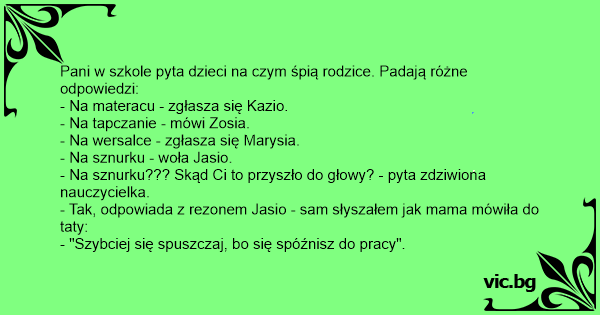 Pani w szkole pyta dzieci na czym śpią rodzice. Padają różne odpowiedzi: