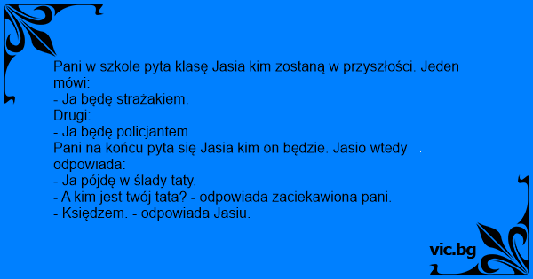 Pani w szkole pyta klasę Jasia kim zostaną w przyszłości. Jeden mówi: