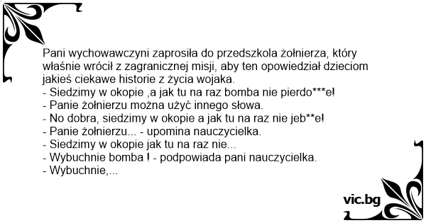 Pani wychowawczyni zaprosiła do przedszkola żołnierza, który właśnie wrócił z zagranicznej misji, aby ten opowiedział dzieciom jakieś ciekawe historie z życia wojaka.