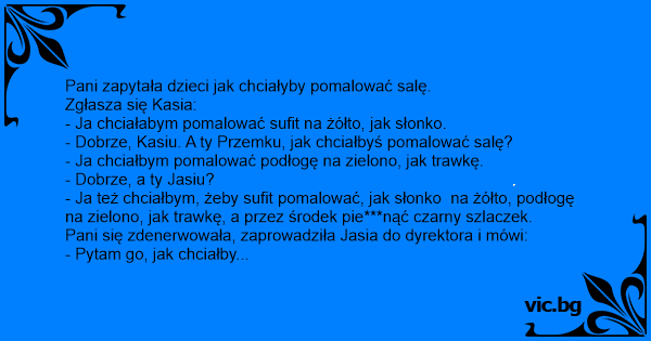 - Pytam go, jak chciałby pomalować salę, a on mówi, że chciałby, aby sufit pomalować na żółto, jak słonko, podłogę na zielono, jak trawkę, a przez środek pie***nąć czarny szlaczek.