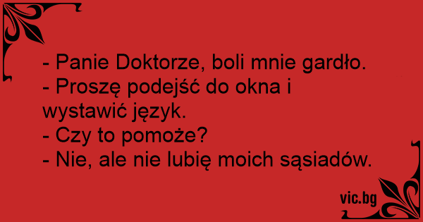 Pacjent wchodzi do gabinetu, a lekarz: - Proszę stanąć przy oknie i wytknąć język. - Ale dlaczego? - Aaa... Bo nie lubię tej baby, co mieszka naprzeciwko.