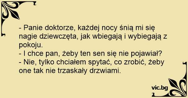- Panie doktorze, każdej nocy śnią mi się nagie dziewczęta, jak wbiegają i wybiegają z pokoju.