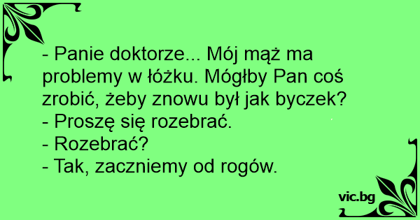 - Докторе, секса с мъжа ми вече не е същия, може ли да направите нещо, така че той да е като преди? - Разбира се, съблечете се. - Ама то не е за мен, нещо за него трябва. - Знам, ще го направя като БИК направо, съблечете се. - Ама... - Скъпа госпожо, искате бик, нека почнем с рогата ...