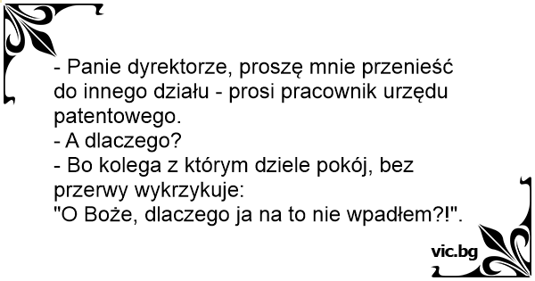 - Panie dyrektorze, proszę mnie przenieść do innego działu - prosi pracownik urzędu patentowego.