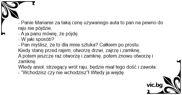 - Panie Marianie za taką cenę używanego auta to pan na pewno do raju nie pójdzie.