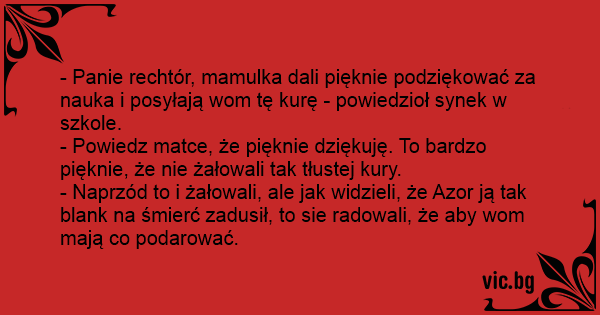 - Panie rechtór, mamulka dali pięknie podziękować za nauka i posyłają wom tę kurę - powiedzioł synek w szkole.
