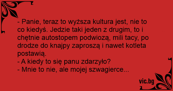 - Panie, teraz to wyższa kultura jest, nie to co kiedyś. Jedzie taki jeden z drugim, to i chętnie autostopem podwiozą, mili tacy, po drodze do knajpy zaproszą i nawet kotleta postawią.