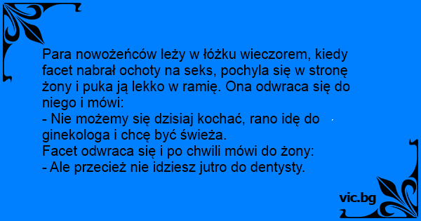 На забар Squeaky Clean Doctor's Appointment Tomorrow Chiste del ginecólogo y el dentista Zahnarzt-Termin Ραντεβού στον γυναικολόγο Ραντεβού με τον οδοντίατρο Една вечер след като семейна двойка си легнали, мъжът нежно потупал съпругата си по рамото. Тя: Ночь. Мужу не спится, хочется, и он теребит жену. Она отвечает: One night, a couple is in the bed and the husband smoothly caresses their wife's arm... the wife is turned and she tells him: Un couple vient de se coucher. L'homme dit à sa femme : - Скъпи, гинекологът ми каза, две седмици никакъв секс! Ένα βράδυ ένα ζευγάρι έχει πέσει για ύπνο. Ο άνδρας αρχίζει να χαϊδεύει τη γυναίκα του απαλά. Αυτή γυρίζει και του λέει : A lady tells her husband, “My gynecologist said I can’t have sex for two weeks.” He replies, “What did your dentist say?” Un soir, alors qu’un couple se couche, le mari commence à caresser le bras de sa femme. Elle se retourne et lui dis: "Je suis désolé chéri, j’ai un rendez-vous chez le gynécologue demain et je veux rester ‘fraîche’." Le mari déçu se retourne. Quelques minutes plus tard, il se tourne de nouveau... Una pareja se acuesta en la cama, y el marido empieza a tocar a su esposa. La mujer se resiste y dice: - Lo siento amor, pero mañana temprano tengo cita con el ginecólogo y quiero estar fresca. Entonces el esposo le contesta: - Ok, pero con el dentista no tienes cita? Чоловік каже до жінки: — Люба, займімось любов’ю? Жінка: — Мені не можна, завтра до гінеколога йти! Чоловік образився, відвернувся до стінки. За декотрий час повертається й питає: — А до стоматолога тобі не треба? C'est un couple qui vient de se coucher. Le type a vraiment envie de faire l'amour. Mais sa compagne réplique qu'elle a un rendez-vous chez le gynécologue et elle veut rester fraîche. Un peu plus... Mitt i natten vaknar mannen, kryper ner till hustrun och gör några försiktiga närmanden. - Nej, det går inte, säger frun bestämt. Imorgon ska jag till gynekologen. Mannen tänker efter, kryper... Eheleute liegen im Bett und er hat Lust auf Sex. Seine Frau lehnt ab, weil sie am nächsten Tag einen Gynäkologentermin hat und deshalb möchte sie jetzt nicht. Er dreht sich zur Seite und versucht... Mann og kone ligger i senga en kveld når mannen prikker kona på skulderen og beginner å klappe armen hennes. Kona snur seg og sier «Beklager kjære. Jeg skal til gynekologen i morgen og vil være ren... Ein Ehepaar ist zu Bett gegangen und nach einer Weile deutet er an, dass er Sex haben will. Sie lehnt ab: "Ich habe morgen einen Termin beim Gynäkologen und deshalb mag ich jetzt nicht." Er dreht... Emiel ligt al de halve nacht te woelen. Op een gegeven moment maakt hij zijn vrouw wakker en zegt: "Schatje, ik heb zo'n zin om met je te vrijen?" Zijn vrouw zegt: "Uhhh .... nee liefje, dat kan... Wife comes back from the doctor and says to her husband: Honey, I have a sad news - a gynecologist told me not have sex for a three weeks... Husband: And what the dentist said? Na cama, o sujeito começa a acariciar a mulher, mas ela o repele: — Sinto muito, querido, mas amanhã eu tenho uma consulta no ginecologista e... — Já entendi — diz o marido, contrariado. E depois... „Schatz, mein Frauenarzt sagt wir können erstmal keinen Sex haben.“ …„und was sagt dein Zahnarzt?“ Na, Schatz, wie wär’s… wollen wir heute Abend mal wieder…? - Bitte heute nicht, Du weißt doch, dass ich morgen einen Termin beim Frauenarzt habe! - Na ja, aber Du hast doch nicht auch noch einen... Un uomo si sveglia eccitatissimo nel mezzo della notte. Sveglia la moglie e le propone una sveltina. Ma la moglie risponde: - 'Domani ho un appuntamento con il ginecologo. Sai che non voglio farlo... Eräänä iltana pariskunta makaa sängyllä ja aviomies taputtaa vaimoa olkapäälle ja alkaa hieromaan vaimon käsivartta. Vaimo kääntyy ja sanoo: - Sori kulta, tapaan huomenna gynekologin ja haluan... Det är natt, och mannen kryper närmare hustrun. - Det går inte, jag ska till gynekologen imorgon, säger frun. Han drar tillbaka handen. Men efter en liten stund frågar mannen hoppfullt. - Men du... Killen låg i sängen och trevade efter tjejen, i hopp om att få något. - Nej, inte ikväll sa tjejen. Jag ska till gynekologen imorgon bitti och vill vara någorlunda fräsch. Sedan blev det tyst,... Barbatul:Nevasta, nu ai chef de sex? Nevasta:Nu pot ca maine merg la ginecolog, B: (dupa 5 minute)Da la dentist te duci?? - Min gynekolog sa att jag inte kan ha sex på två veckor. - Jaha, men din tandläkare har väl inte avrådit från sex…