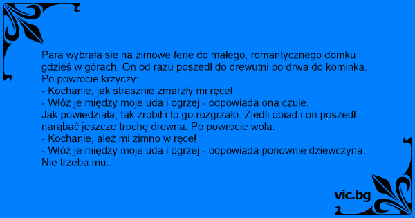 Para wybrała się na zimowe ferie do małego, romantycznego domku gdzieś w górach. On od razu poszedł do drewutni po drwa do kominka. Po powrocie krzyczy: