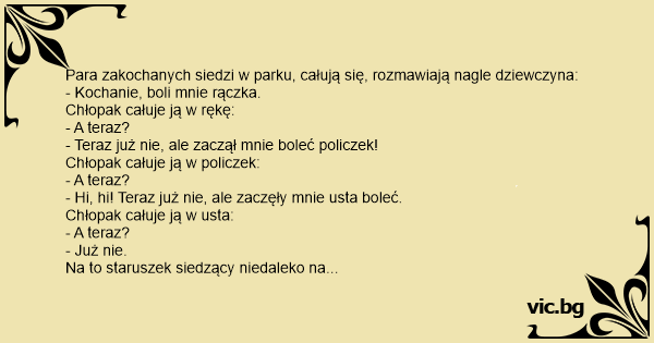 Една вечер в парка двама младежи си седят и си говорят. До тях на съседната пейка седи сляп старец. Момчето е много притеснително, а момичето през цялото време се чуди как да го накара да я целуне: - Ох, ръката ме заболя - възкликва в тишината то. Момчето веднага и взима ръката и я целува. -...