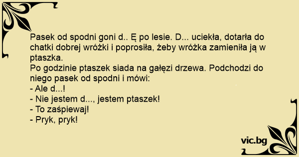 Pasek od spodni goni d.. Ę po lesie. D... uciekła, dotarła do chatki dobrej wróżki i poprosiła, żeby wróżka zamieniła ją w ptaszka.