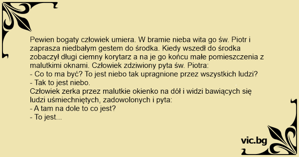Pewien bogaty człowiek umiera. W bramie nieba wita go św. Piotr i zaprasza niedbałym gestem do środka. Kiedy wszedł do środka zobaczył długi ciemny korytarz a na je go końcu małe pomieszczenia z malutkimi oknami. Człowiek zdziwiony pyta św. Piotra: