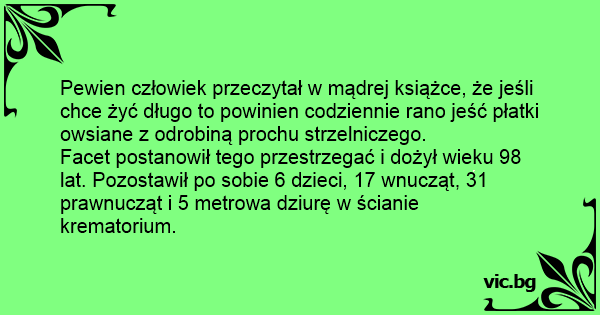 Pewien człowiek przeczytał w mądrej książce, że jeśli chce żyć długo to powinien codziennie rano jeść płatki owsiane z odrobiną prochu strzelniczego.