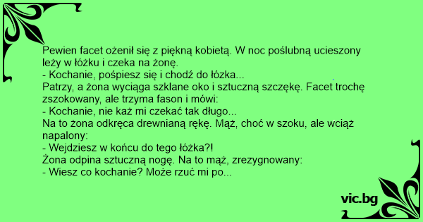 Patrzy, a żona wyciąga szklane oko i sztuczną szczękę. Facet trochę zszokowany, ale trzyma fason i mówi: