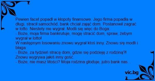 Pewien facet popadł w kłopoty finansowe. Jego firma popadła w długi, stracił samochód, bank chciał zająć dom. Postanowił zagrać w lotto. Niestety nie wygrał. Modli się więc do Boga: