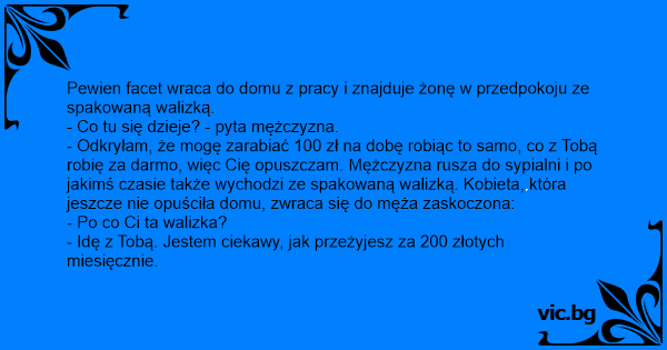 - Odkryłam, że mogę zarabiać 100 zł na dobę robiąc to samo, co z Tobą robię za darmo, więc Cię opuszczam. Mężczyzna rusza do sypialni i po jakimś czasie także wychodzi ze spakowaną walizką. Kobieta, która jeszcze nie opuściła domu, zwraca się do męża zaskoczona: