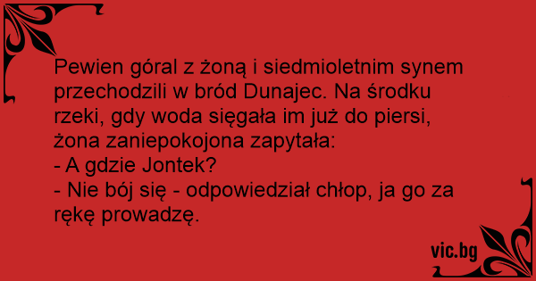 Pewien góral z żoną i siedmioletnim synem przechodzili w bród Dunajec. Na środku rzeki, gdy woda sięgała im już do piersi, żona zaniepokojona zapytała: