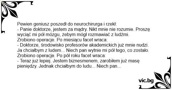 - Panie doktorze, jestem za mądry. Nikt mnie nie rozumie. Proszę wyciąć mi pół mózgu, żebym mógł rozmawiać z ludźmi.