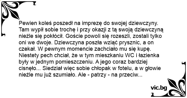Pewien koleś poszedł na imprezę do swojej dziewczyny. Tam wypił sobie trochę i przy okazji z tą swoją dziewczyną nieźle się pokłócił. Goście powoli się rozeszli, zostali tylko oni we dwoje. Dziewczyna poszła wziąć prysznic, a on czekał. W pewnym momencie zachciało mu się kupę. Niestety pech chciał, że w tym mieszkaniu WC i łazienka były w jednym pomieszczeniu. A jego coraz bardziej cisnęło... Siedział więc sobie chłopak w fotelu, a w głowie nieźle mu już szumiało. Ale - patrzy - na przeciw niego, pod ścianą, siedzi pies i patrzy mu się prosto w oczy. Pomyślał więc sobie: