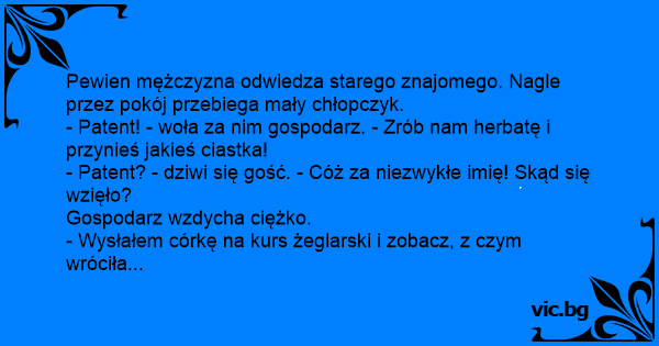 - Patent? - dziwi się gość. - Cóż za niezwykłe imię! Skąd się wzięło?