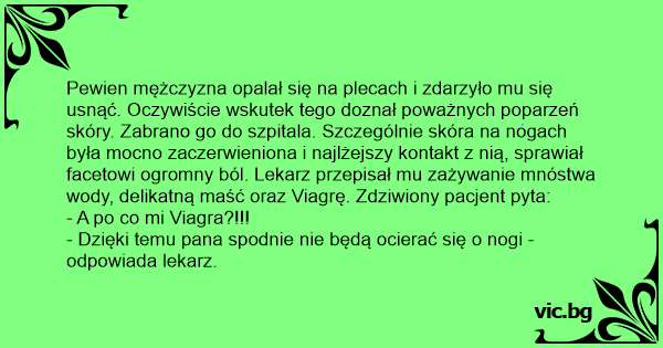 Pewien mężczyzna opalał się na plecach i zdarzyło mu się usnąć. Oczywiście wskutek tego doznał poważnych poparzeń skóry. Zabrano go do szpitala. Szczególnie skóra na nogach była mocno zaczerwieniona i najlżejszy kontakt z nią, sprawiał facetowi ogromny ból. Lekarz przepisał mu zażywanie mnóstwa wody, delikatną maść oraz Viagrę. Zdziwiony pacjent pyta: