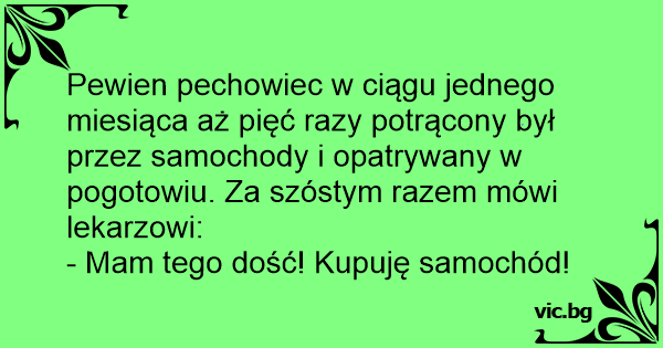 Pewien pechowiec w ciągu jednego miesiąca aż pięć razy potrącony był przez samochody i opatrywany w pogotowiu. Za szóstym razem mówi lekarzowi: