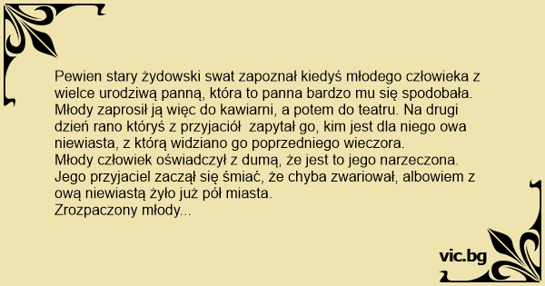 Pewien stary żydowski swat zapoznał kiedyś młodego człowieka z wielce urodziwą panną, która to panna bardzo mu się spodobała.